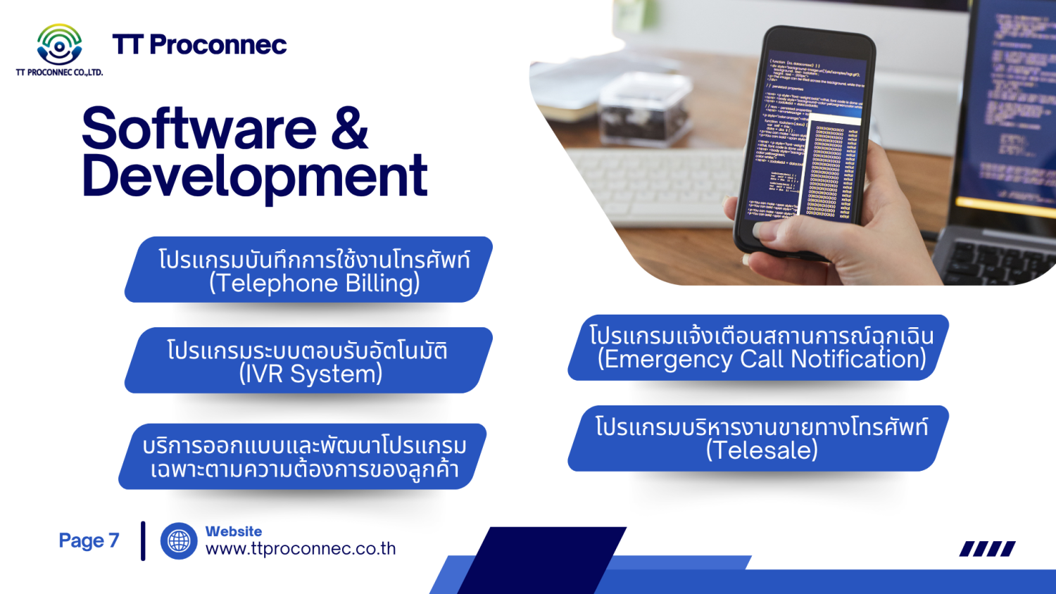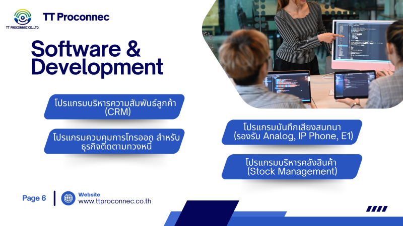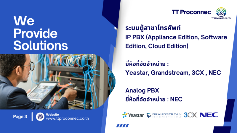 ประกอบกิจการขายปลีก ขายส่ง ตู้สาขาโทรศัพท์ ระบบเน็ตเวิร์ค กล้องวงจรปิด ระบบรักษาความปลอดภัย คอมพิวเตอร์ ซอฟร์ตแวร์ และระบบประกาศเสียงตามสาย